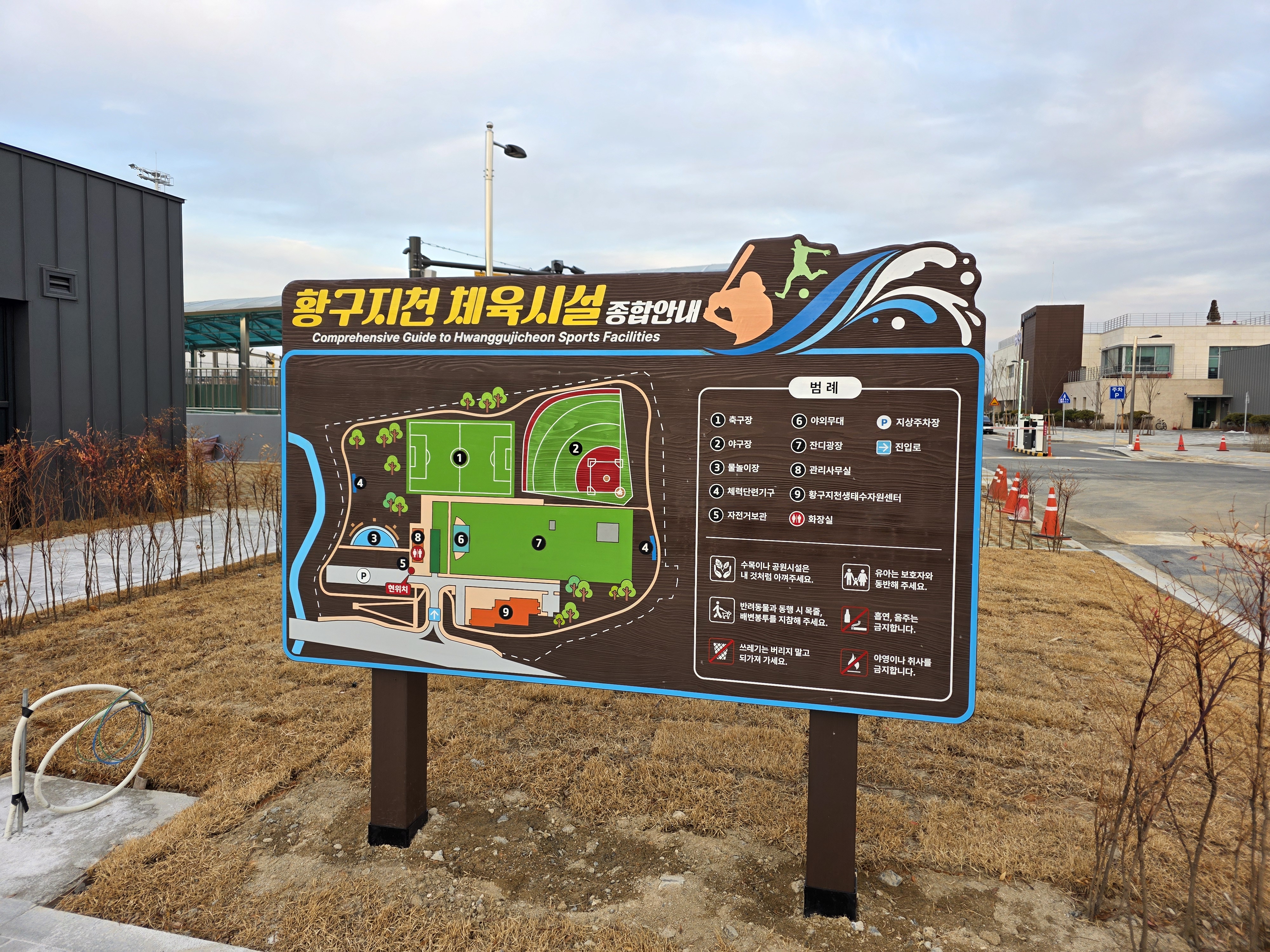 입구 쪽에 황구지천 체육시설 종합안내판이 있고 그 옆으로는 주차장이 있다.
