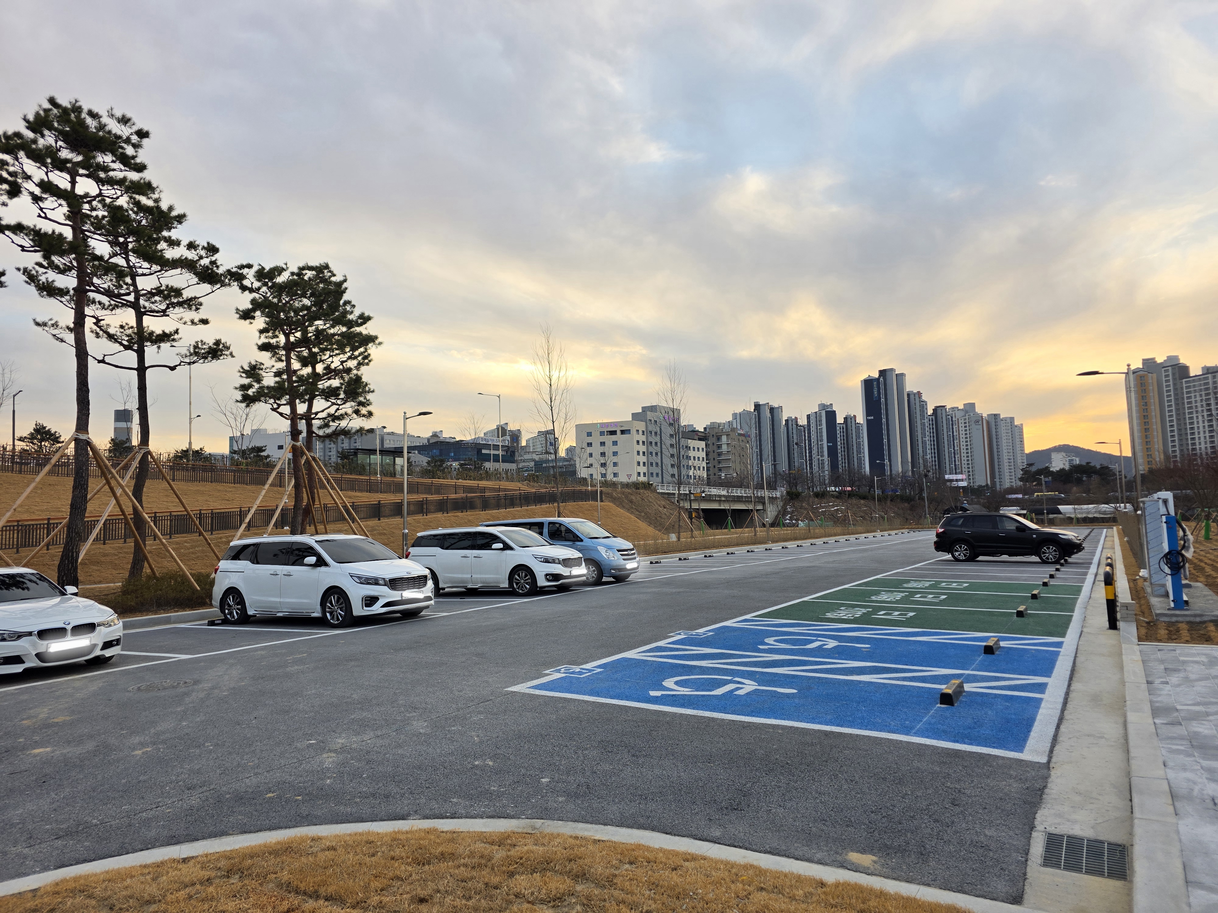 한 40여 대 정도 댈 수 있는 공간이 있고 전기차 충전소도 3곳 있었다.
