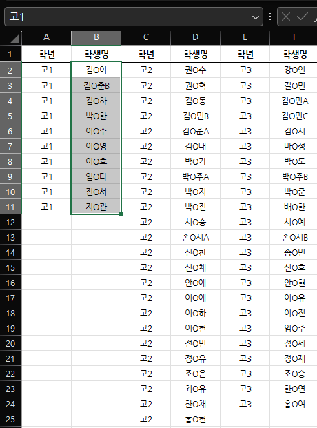 예를 들어 "고1"이라는 문자열이 K2셀에 입력되어 있으면