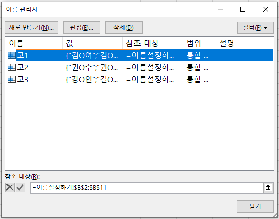 그럴때 이름관리자를 사용해서 데이터 범위에 이름을 설정하고 나면 해당 데이터를 하나의 이름으로 관리할 수 있다.