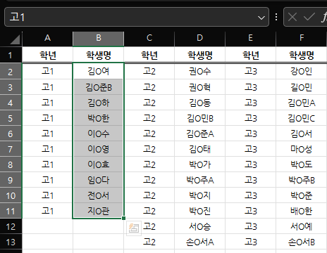 예를 들어 "고1"이라는 문자열이 K2셀에 입력되어 있으면