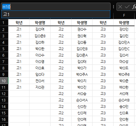 이름 설정 후 해당 이름을 수식에도 적용시킬 수 있는데 고1의 학생수를 구하는 수식을 작성하면