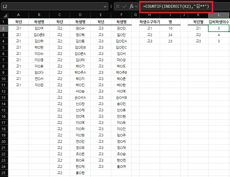 =COUNTIF(INDIRECT(K2),"김**") 이런 식으로 입력하면 값이 3으로 출력된다.