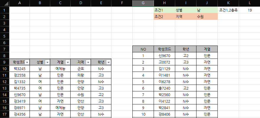 A:E까지의 데이터를 가지고 조건1, 조건2를 만족하는 학생코드, 학년, 계열 데이터를 가져와보도록 하자.