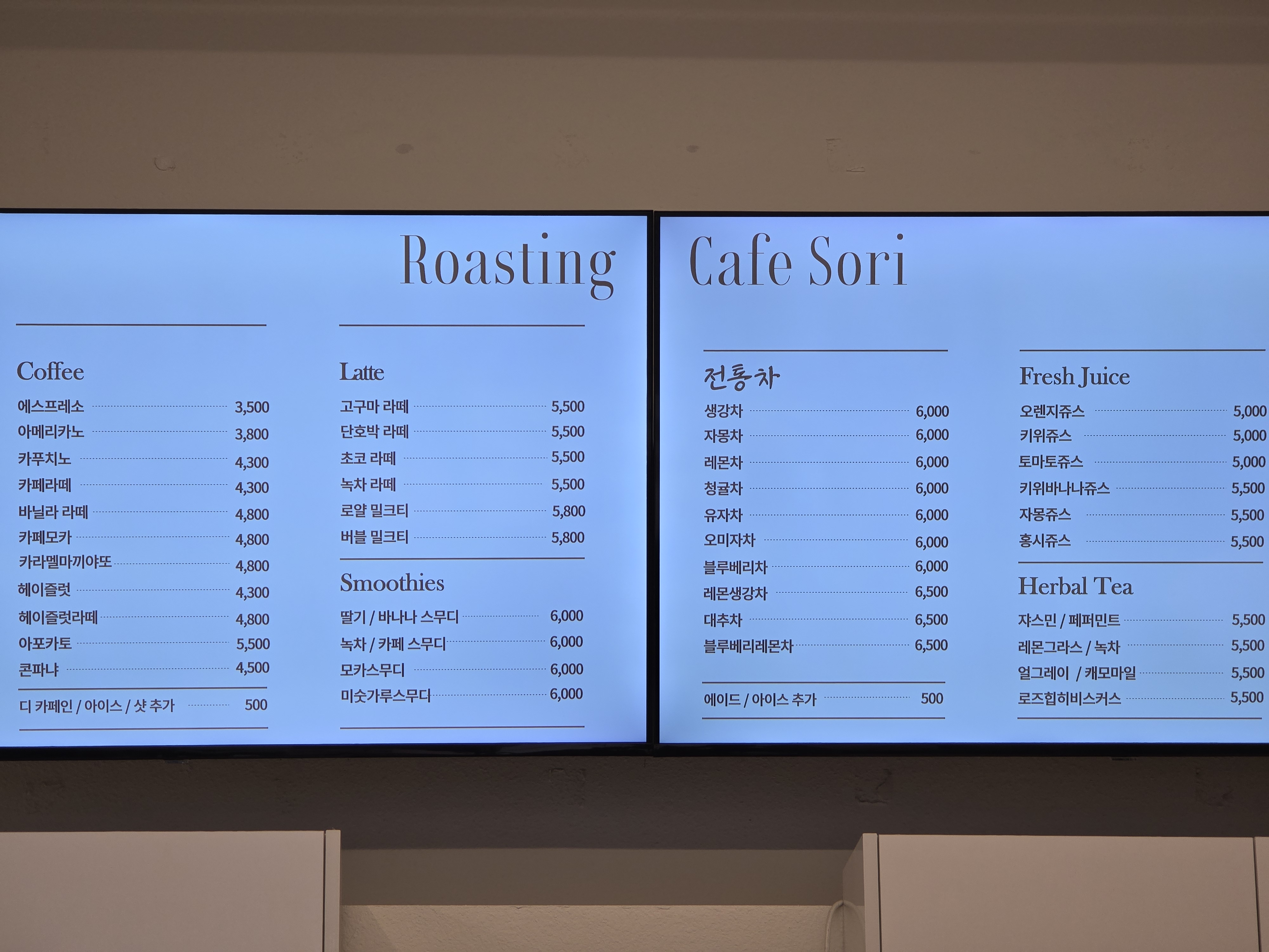 메뉴는 커피 종류뿐 아니라 스무디, 전통차, 티, 과일주스 등 다양했다.