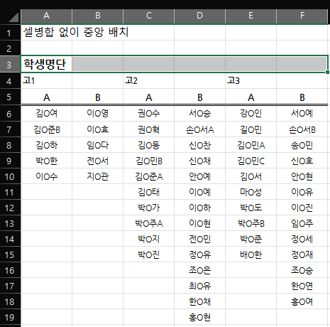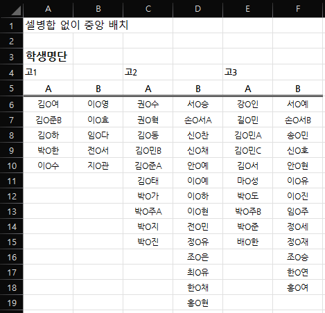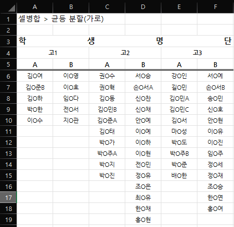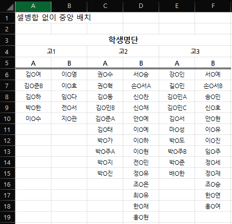 이 데이터로 처음에 선택하려고 했던 고1A~고2A반까지의 데이터를 선택하면 셀 병합된 부분이 없기 때문에
