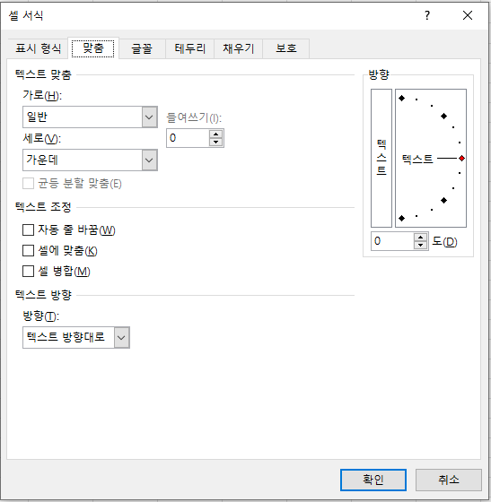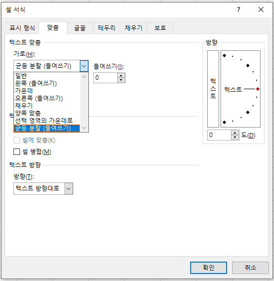 셀 서식에서 맞춤 탭을 누르면 위와 같이 표시 된다.