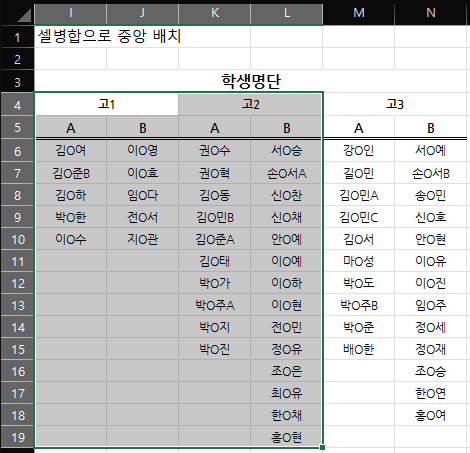 위와 같이 셀병합으로 중앙배치한 경우에는 고1A~고2A반 까지의 데이터를 선택하고자 했지만 K4:L4가 셀 병합이 되어 있기 때문에 그렇게 선택할 수 없다.