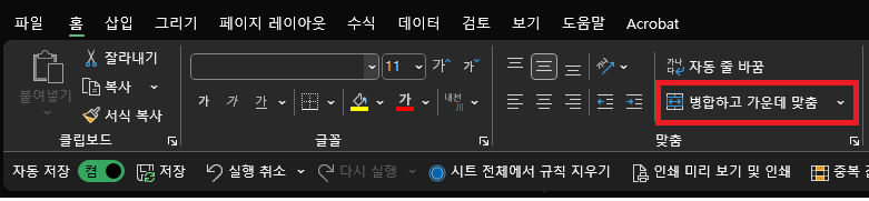 셀 중앙에 데이터 배치하는 건 그냥 셀 병합해서 하는게 클릭한번으로 끝나서 제일 편하긴 하지만 그 방법을 사용하면 데이터 복사를 하거나 필터를 사용하거나 할때 내가 원하는 영역을 설정하지 못하는 경우가 있다.