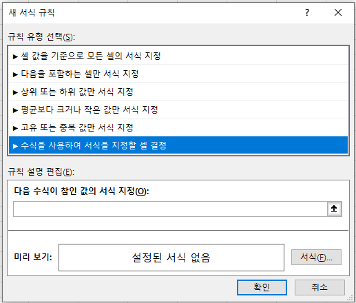 메뉴에서 조건부서식 > 새 규칙을 클릭하면 아래와 같은 대화상자가 열린다.