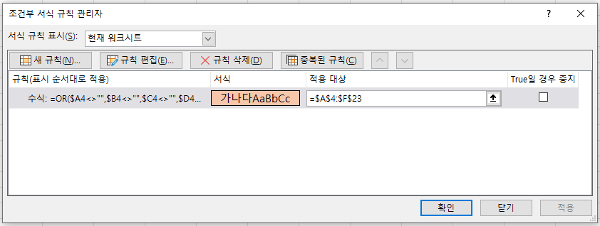 A열에 데이터가 있는 4~8행만 조건부서식이 적용된 것을 확인할 수 있다.
