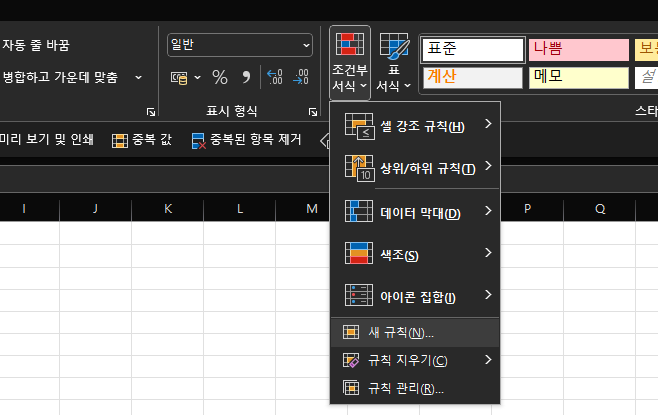 위와 같이 조건부서식을 지정할 범위를 선택한다.