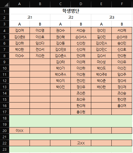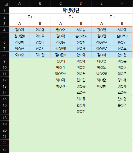 A~F열 기준 데이터가 있는 17행까지 조건부 서식이 적용된 것을 확인할 수 있다.