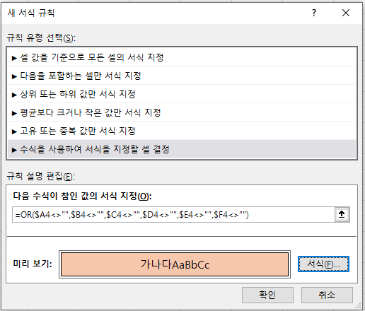 =OR($A4<>"",$B4<>"",$C4<>"",$D4<>"",$E4<>"",$F4<>"") .. OR함수로 A~F열 중 한 열에만 데이터가 있어도 TRUE 값이 나올수 있도록 규칙을 설정하고