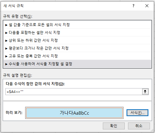 =$A4<>"" ... 이렇게만 입력해 주면 된다.