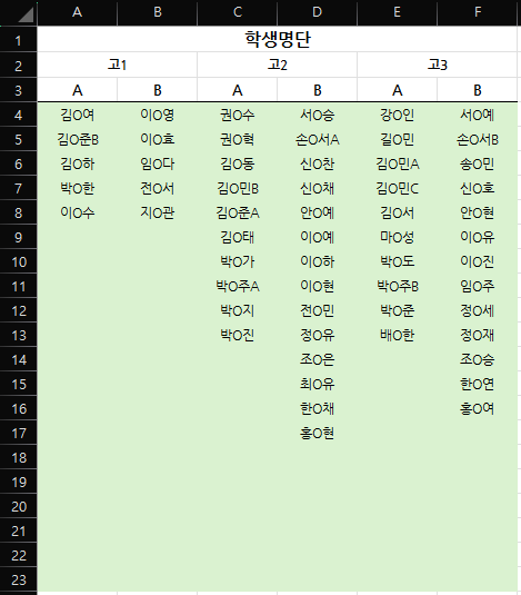아래의 데이터로 조건부서식을 적용하여 자동으로 서식적용하는 방법을 알아보자.
