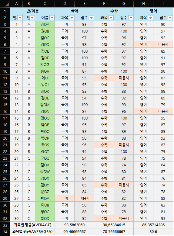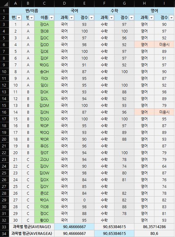 >> 국어 점수에서 미응시를 0으로 바꾸면 숫자셀이 30셀이 되기 때문에 AVERAGEA의 결과 값과 동일하게 표시됨.