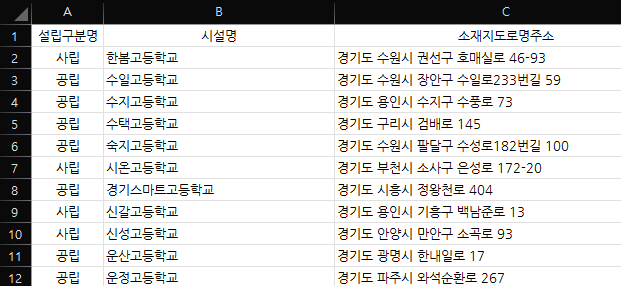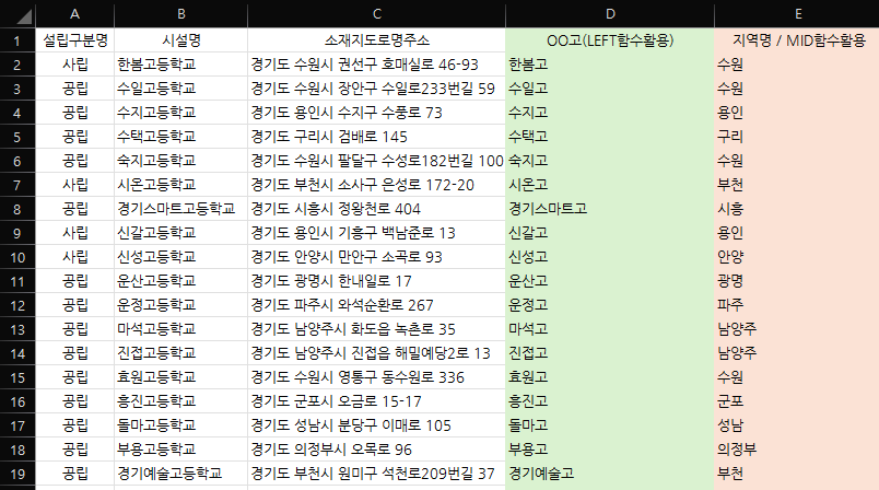우선 시설명의 고등학교 글자는 6글자 고정이 아니고 B8셀과 같이 글자수가 많은 고등학교들도 있다.