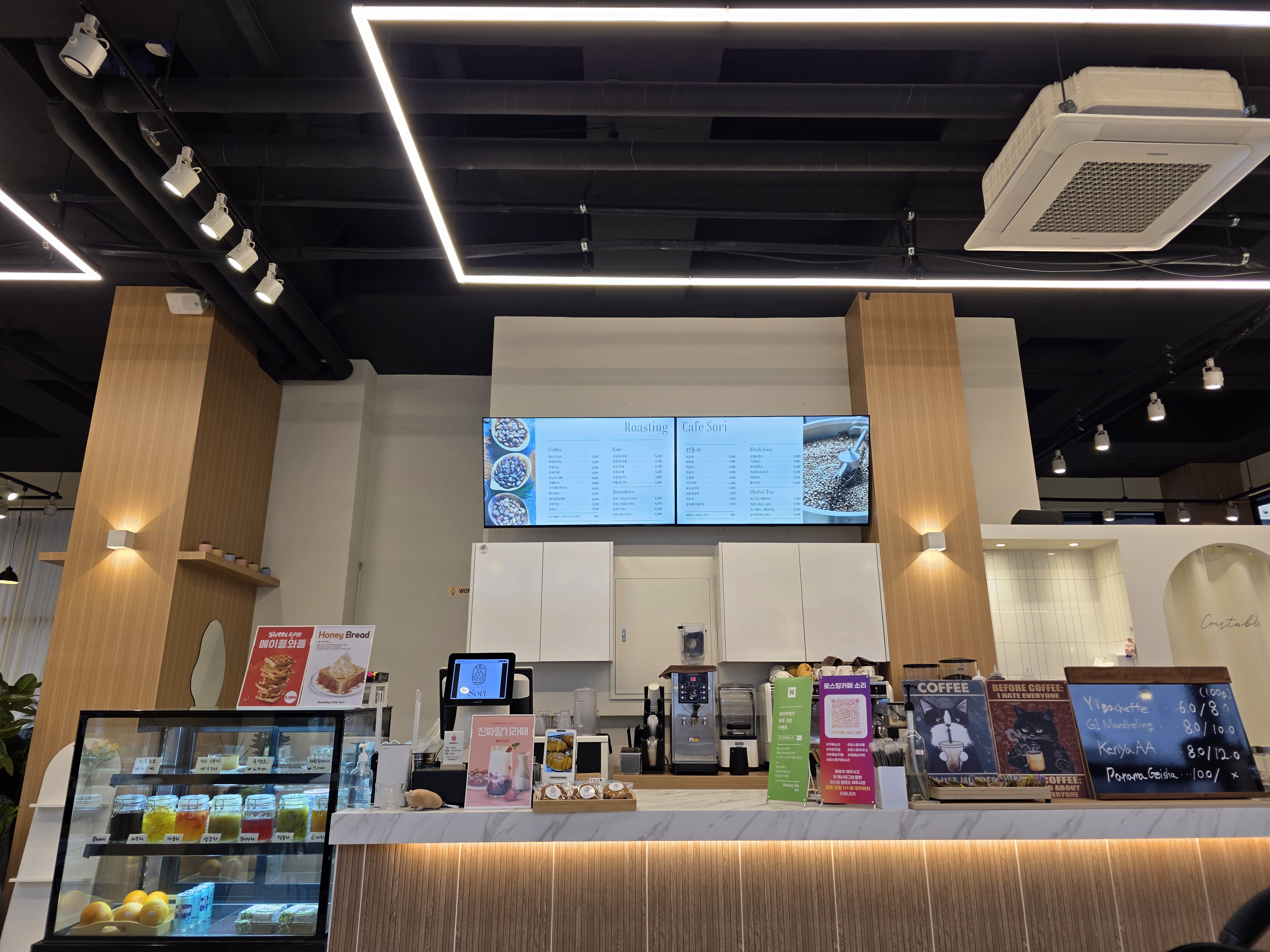 주문하는 곳 오른쪽으로는 로스팅하는 공간인 것 같은데? 깔끔하다. 천장은 블랙 벽은 화이트.