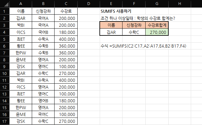 위 표에서 처럼 김AR학생의 수강료 합계를 찾는다고 하면 아래와 같이 지정할 수 있다.