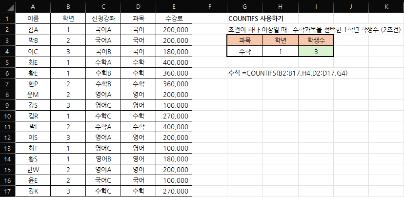 =COUNTIFS(조건범위1,조건1,조건범위2,조건2) .. 조건2(과목)을 찾는 범위 D2:D17
