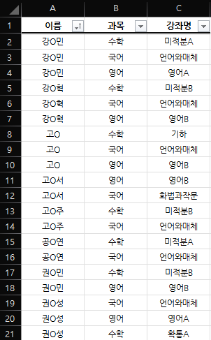 위 표와 같이 학생별 수강과목, 세부강좌명이 있는 데이터에서 학생별, 과목별 어떤 세부강좌를 듣는지 확인하는 수식을 짜보자.