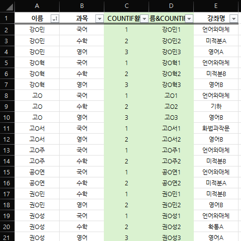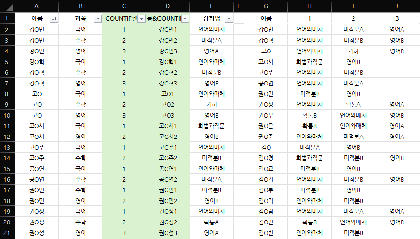 그럴때 이름과 과목을 "&"로 합쳐서 데이터를 만든 다음 그 데이터를 통해 강좌명을 선택하는 방식으로 수식을 작성하면 원하는 데이터를 얻을 수 있다.